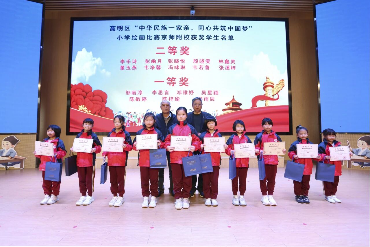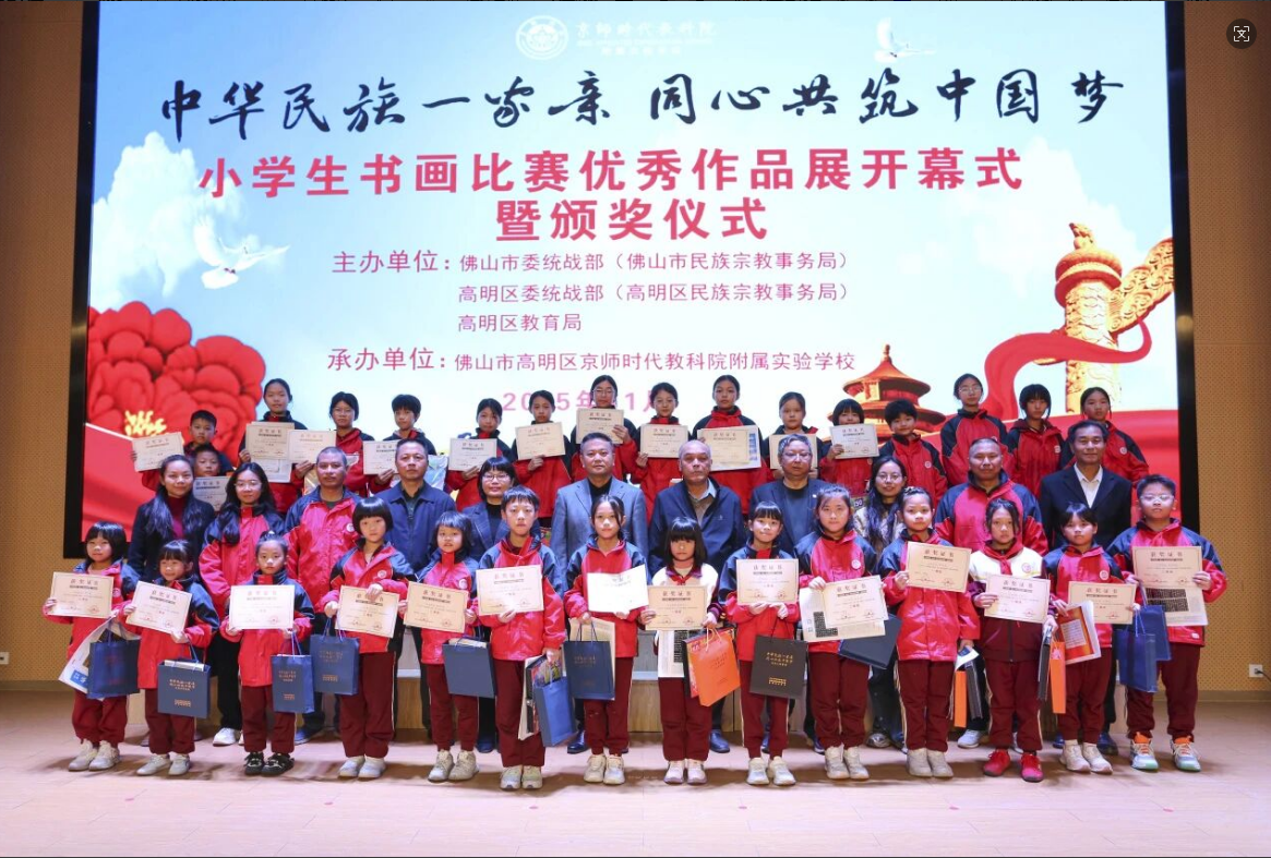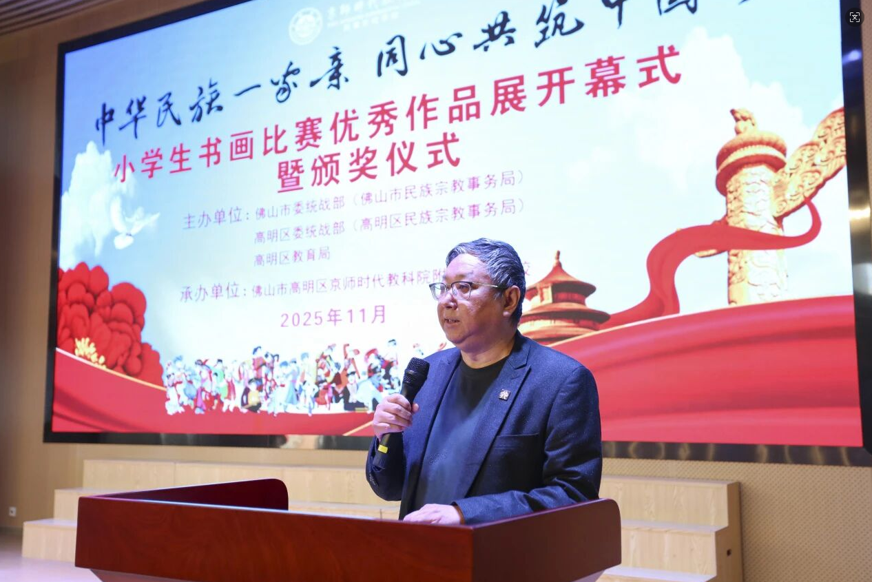 2025年11月20日下午,由湾区(广东)教育研究院联合《书法报》广东大湾区工作站策划和指导,佛山市委统战部(佛山市民族宗教事务局)、高明区委统战部(高明区民族宗教事务局)、高明区教育局主办,京师附校承办的佛山市高明区“中华民族一家亲,同心共筑中国梦”小学生书画大赛优秀作品展开幕式暨颁奖仪式在京师附校大讲堂隆重举行。