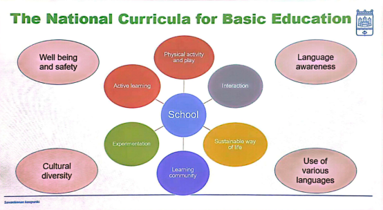 这一质朴而深刻的理念,在芬兰国家基础教育体系中得到了淋漓尽致的完美呈现。其课程架构以环形图案为核心设计,贴近学校的第一个圆圈,涵盖六大核心内容:体育活动与玩耍、主动学习、互动、实验、学习社区、可持续的生活方式;最外围则是四大关键领域:语言意识、各种语言的使用、文化多样性、安全与良好的生存。